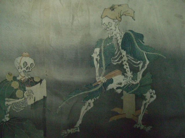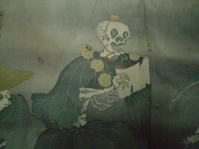 この羽裏はしかもその名場面を手描きの骸骨が演じています。
