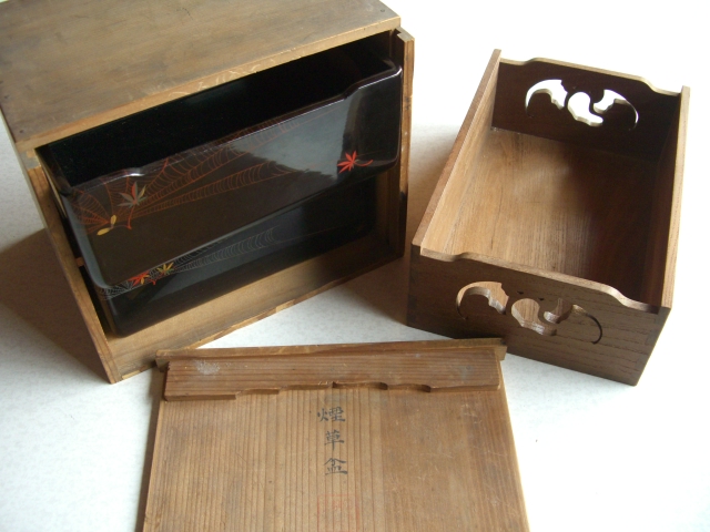 火入れや灰吹(はいふき)などをセットにして入れた小さい箱です。